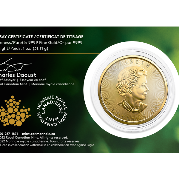These coins feature all the security, quality, and purity of the standard gold maples, and are made only with gold sourced directly from Agnico Eagle. These unique coins feature a new engraving signaling their single origin status and come individually sealed in an assay card.