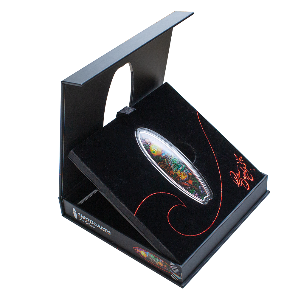- Unique surfboard shaped legal tender silver coin