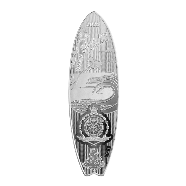 - Unique surfboard shaped legal tender silver coin