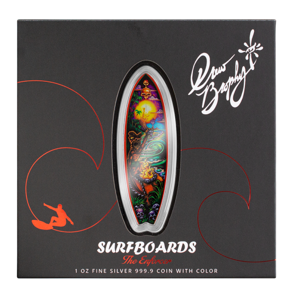 Surf’s up! The Drew Brophy Surfboards “Enforcer” 1 oz silver coin is an exhilarating new collaboration between PAMP Suisse and surfing legend Drew Brophy.