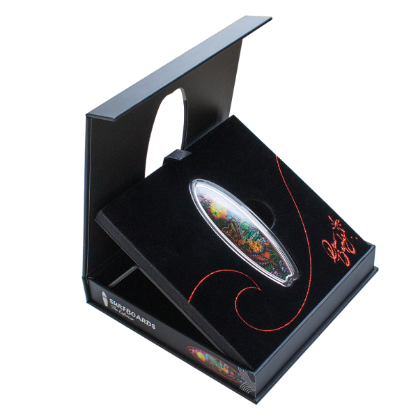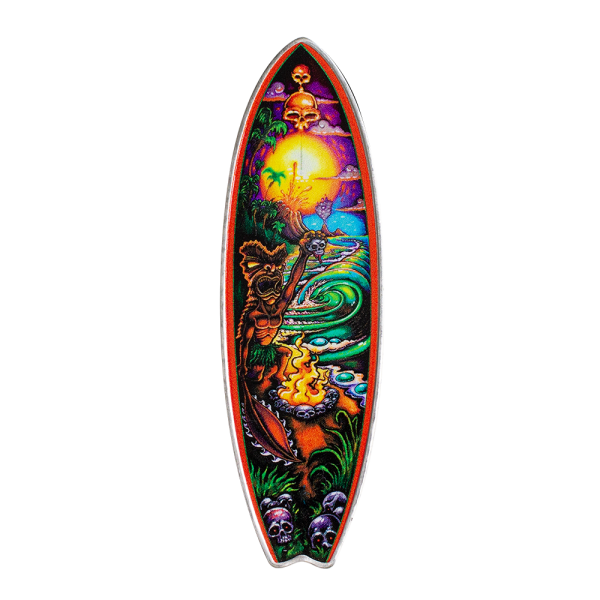 With a limited mintage of 3000, these coins feature a unique surfboard shape and feature a Pacific Polynesian motif. One side of the coin is engraved in exquisite detail, while the other springs to life with the vibrant and dynamic artistry Drew Brophy is recognized for.