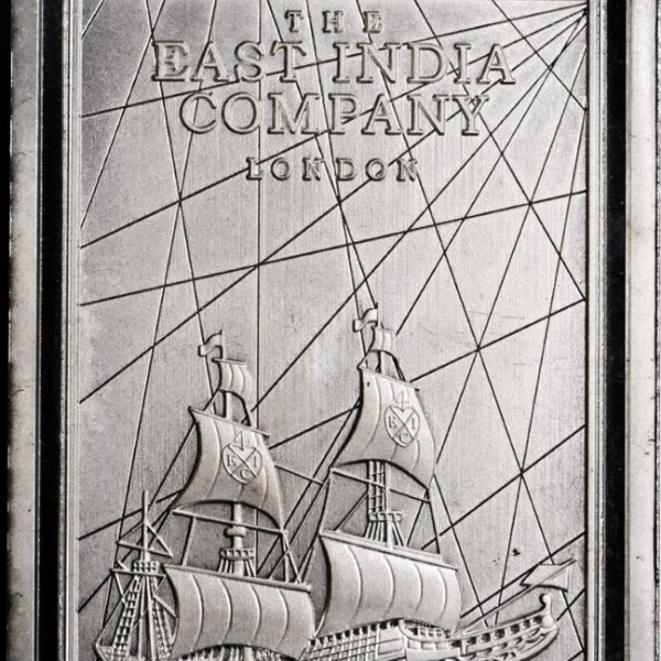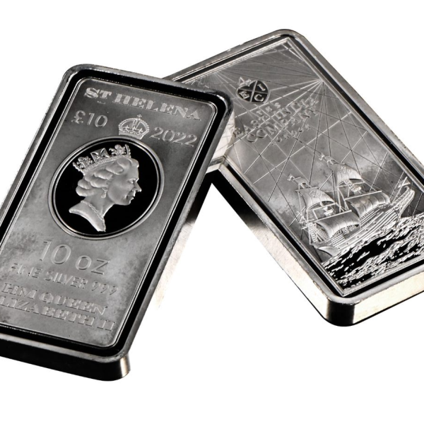 The Saint Helena £10 Official legal tender coin is struck in .999 fine silver, and weighs 10 oz. The obverse bears the effigy of Her Majesty Queen Elizabeth I, the issuing country St. Helena, the denomination £10, the weight, fineness, and the year 2022. The Reverse of the silver coin bar features an East India Company sailing ship, the most magnificent vessels of the era. Above the ship is the chop mark of the East India Company and in the background, nautical sailing lines.