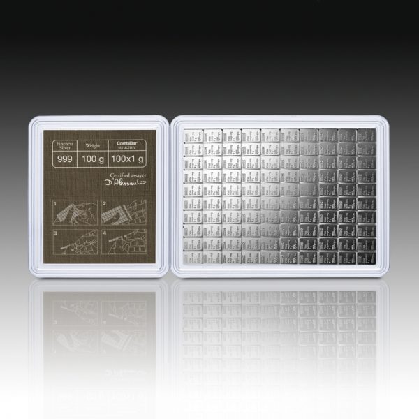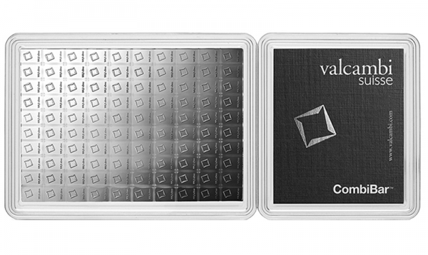These 100g silver bars from Valcambi are a great combination of recognized, high-quality bullion, and unparallelled flexibility in distribution and selling. Individually sealed with respective assay certificate, each CombiBar is easily divisible into single 1g units, allowing investors to sell the exact amount of silver they would prefer. As with all Valcambi products, these products feature precision machining and secure, tamper-proof packaging.