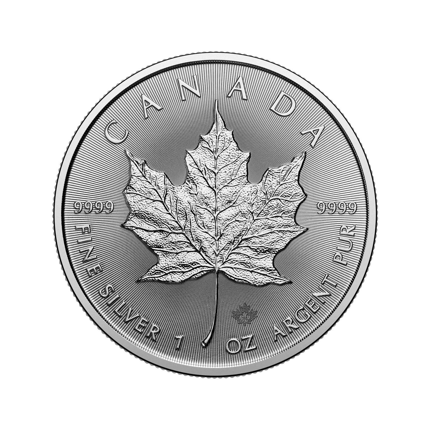 In 2013, the Royal Canadian Mint introduced a unique security feature to verify the authenticity of its bullion coins. The 10 oz Silver Maple Leaf uses technology derived from Canadian currency coins and features a textured maple leaf that is micro-engraved on the reverse side of the coin. The coin’s year of issue is denoted in the centre of this mark and is visible under high magnification.